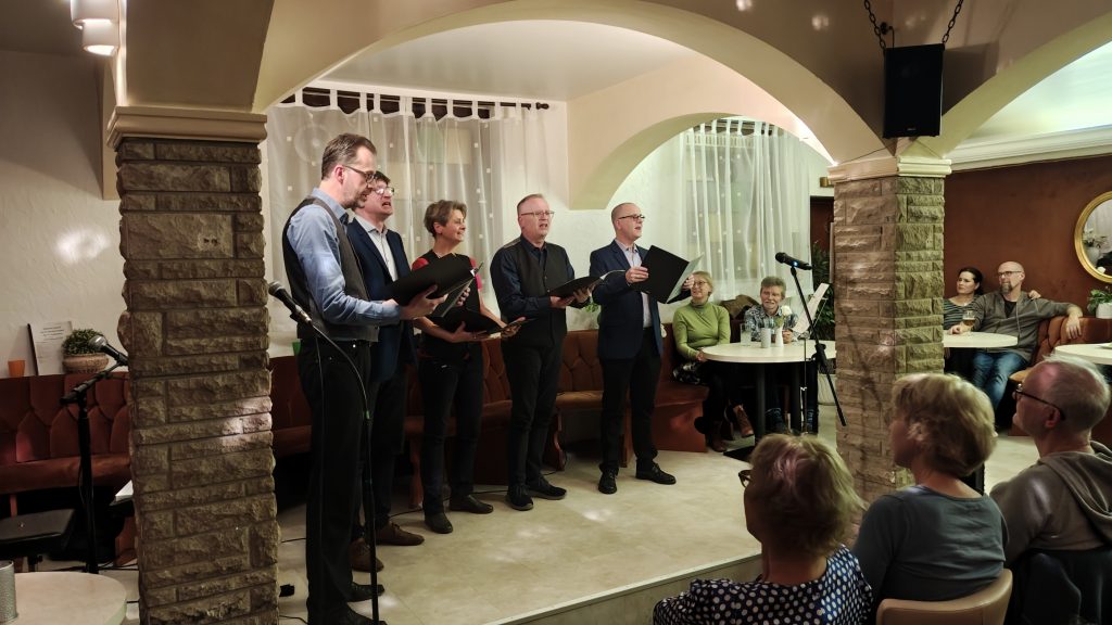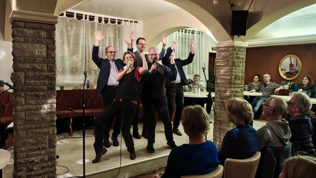 Eine Frau und vier Männer aus den verschiedensten Berufsgruppen – IT, Naturwissenschaften und einem Superintendenten- spielten auf und erinnerten im Stil an so bekannte Formationen wie die Münchner Lach- und Schießgesellschaft oder Lore Lorenz‘ Düsseldorfer Kommödchen. Die Jüngeren unter uns werden sich nicht erinnern können. Mit viel Charme und Witz brachten die Fünf neueste Themen aus Politik, Umwelt und Wirtschaft kritisch auf den Punkt. Stilistisch angelehnt an die großen Vorbilder, aber modernisiert, waren die Mittel, neudeutsch „tools“ genannt, scharfzüngige Soli, Dialoge, Sprechchor, mehrstimmige Gesänge, begleitet von Keyboard und Gitarre.